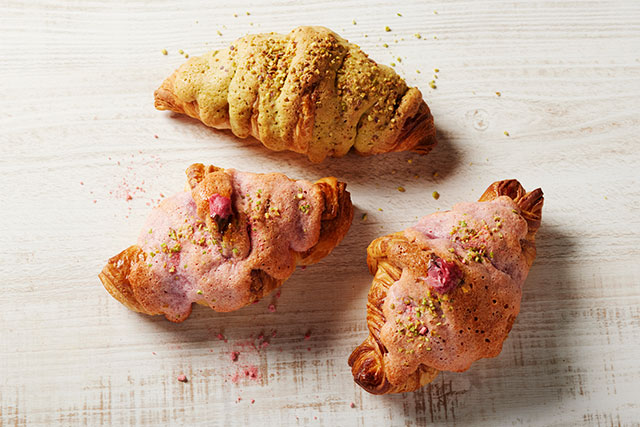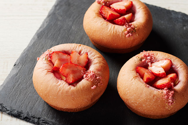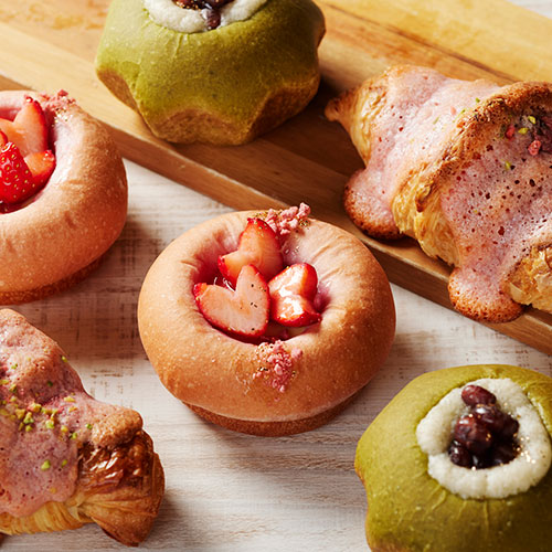 見た目にも愛らしい桜の花を模したあんぱんや、瑞々しいいちごとカスタードクリームを乗せたデニッシュ。いちごと濃厚なピスタチオクリームを挟んだ「GGCo.」で人気のちぎりパンなど、春にふさわしい華やかなスイーツブレッドをお届けいたします。