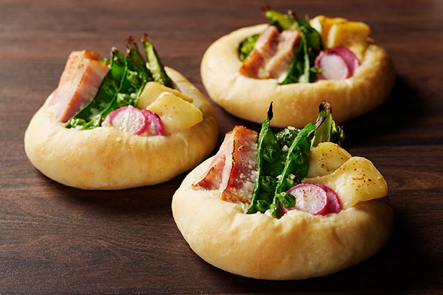厚切りベーコンとカマンベールチーズに、アスパラガス、ブロッコリー、スナップエンドウ、ラディッシュを合わせました。シークラムとレモンを加えたベシャメルソースに、ブラックペッパーが味を引き締める、春らしいフォカッチャです。
