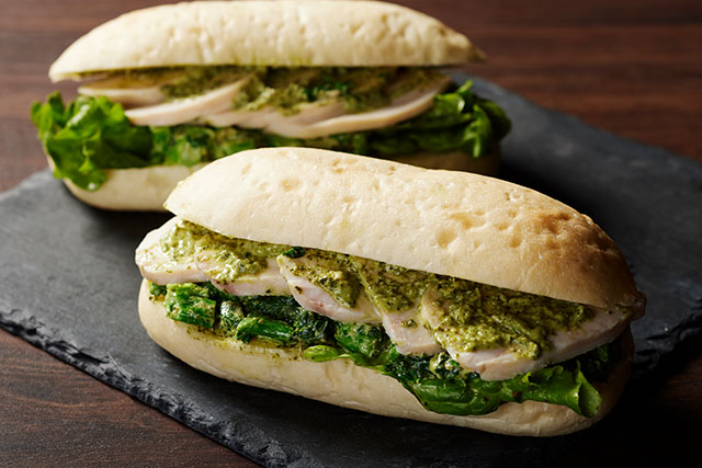 柔らかなホワイトブレッドにチキンと菜の花を合わせ、バジルとマヨネーズのソースをサンド。バジルの香りを軽やかに楽しめる、春らしい味わいのサンドイッチです。