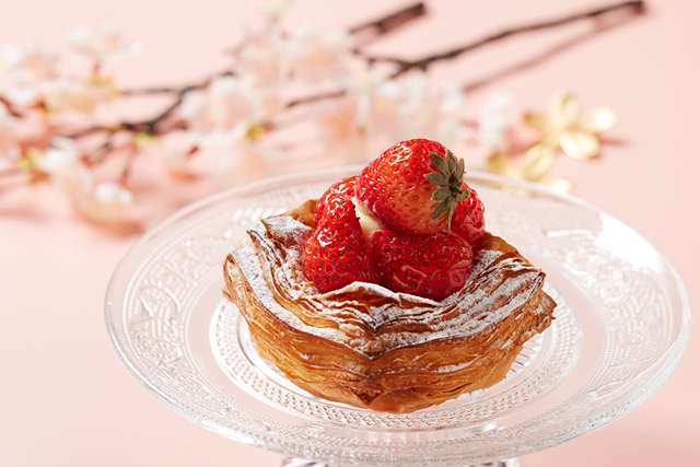 桜色に仕上げた生地に、桜あんとカスタードを重ね、いちごと桜チップをトッピング。いちごの程よい酸味と、見た目にも春らしい可愛らしさが印象的な一品です。